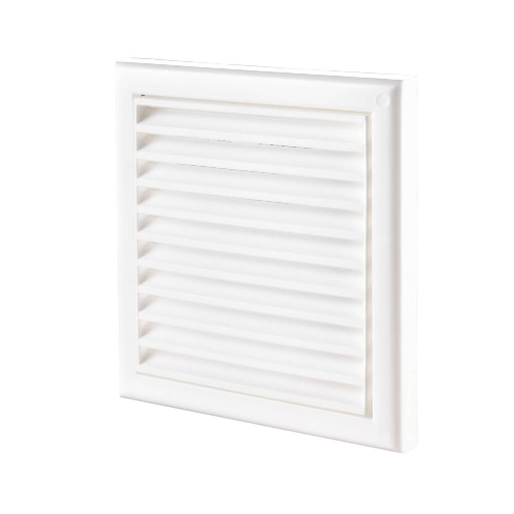 תריס פלסטי דקורטיבי מרובע עם רשת שמונעת חדירת מזיקים להתקנה פנימית או חיצונית המסייע בפיזור נכון של האוויר הנכנס או היוצא דרכו.